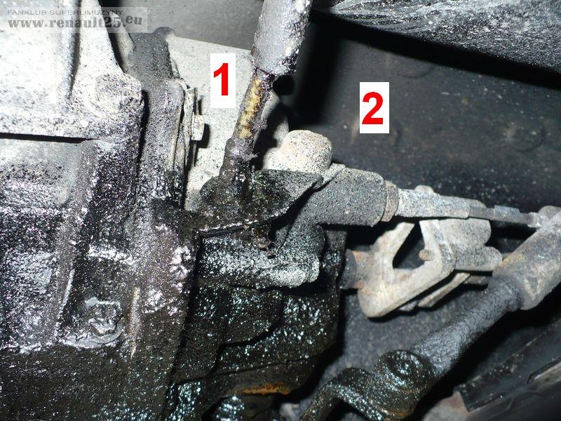 Według mojego oglądu linka prędkościomierza jest podpięta z tyłu skrzyni, po lewej stronie (1). Z tyłu pokrywy wychodzi cięgno wstecznego (2).