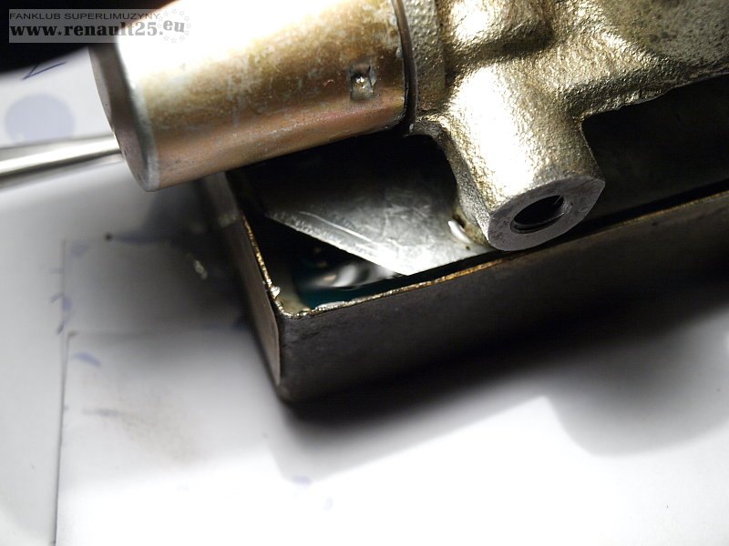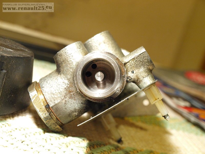 Tak wygląda częściowo rozebrany zawór. Widać zdemontowany silnik krokowy. Wlot oleju pod wysokim ciśnieniem (od przodu ) i wylot oleju do zbiornika wyrównawczego pod niskim ciśnieniem ( u góry ).