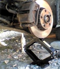 Aby lekko zsunąć łącznik ze stabilizatora, użyjemy drugiego podniośnika. Zapierając go o dolny sworzeń, podnosimy całe zawieszenie do momentu, aż wyczujemy luzy na łączniku.