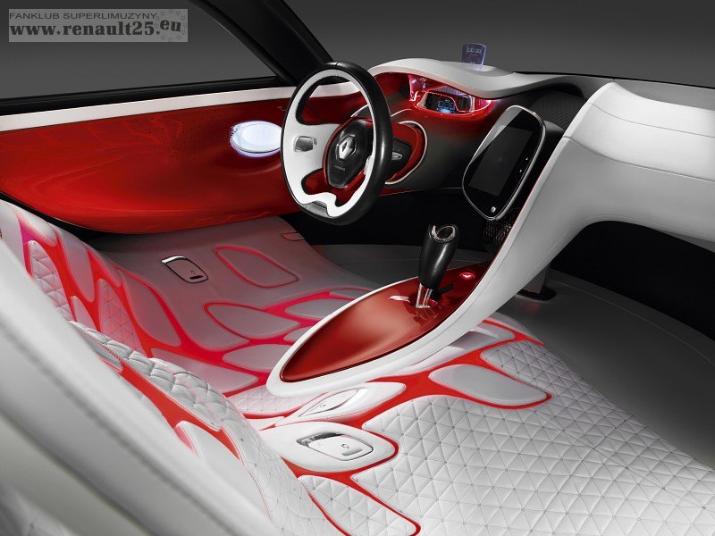Design wewnętrzny wyraża lekkość – kształty są łagodne i lekkie. Dominuje biel z akcentami w mocnym czerwonym kolorze, takim samym jak kolor nadwozia. Zastosowane szlachetne materiały to m.in. biała skóra na fotelach, desce rozdzielczej i podłodze oraz czerwona laka na konsoli i akcesoriach. Siedzenia mają kształt bezpiecznego kokonu i pokryte są białą skórą, inaczej wykończoną po stronie kierowcy i pasażera.