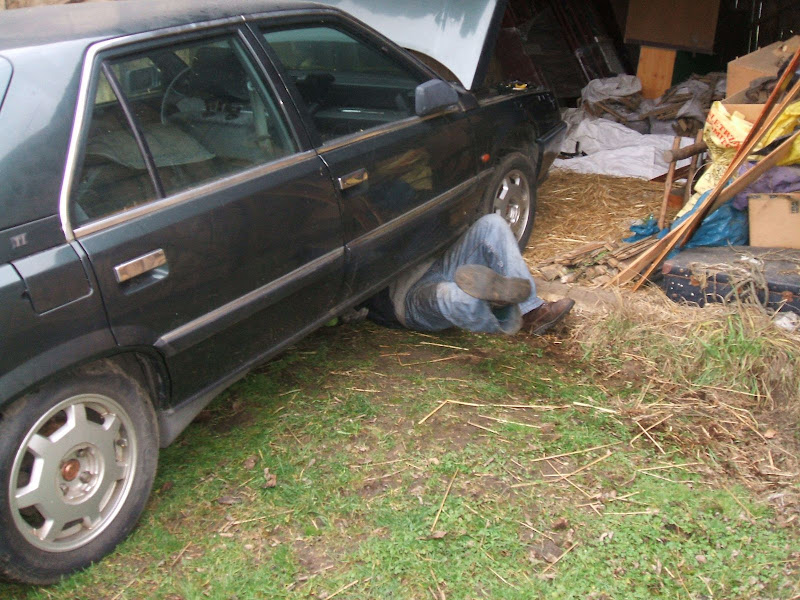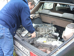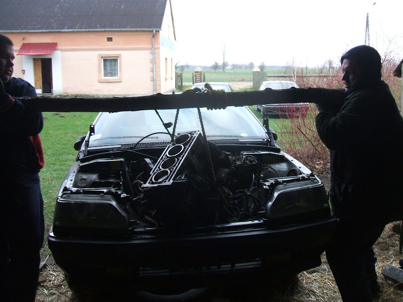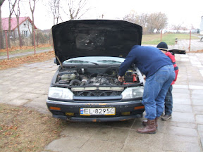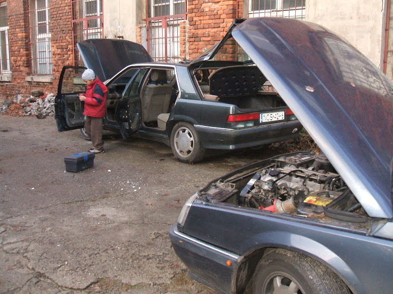 w sobotę 12 grudnia wybraliśmy się do kolegi Mariusza1500 po silnik 12 zaworowy. Mariusz prawie równocześnie nabył R25 TI. Jak się okazało buda tego autka jest w stanie idealnym aż żal jej demontowac. Żadnych śladów korozji poza jakimiś drobnymi, powierzchownymi i nic nie znaczącymi drobiazgami. W silniku tym uszkodzona była prawdopodobnie jedynie głowica Silnik ten po gruntownym przeglądzie i założeniu innej 12 zaworowej głowicy ma byc zamontowany w zdobytej na Mzurach TXI.