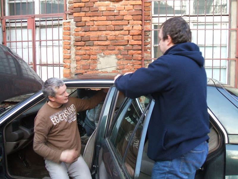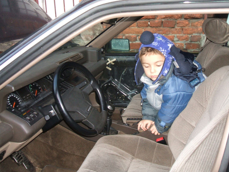 Autko trochę stało. Widać to było po delikatnej zieleni na szybach, znaczkach i innych wystających elementach. Wnętrze w stanie b.dobrym nie licząc tego, że mechanik wrzucił części (w tym wydech czy chłodnicę) na tylne siedzenie. Wcześniej na oględziny wybrał się Skorpion, więc nie jechaliśmy zupełnie w ciemno. Wedzieliśmy, że blacha jest OK. Ma jedynie niewielkie wgniecenie na drzwiach ale to się da usunąc, ewentualnie drzwi się wymieni i polakieruje.