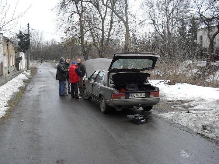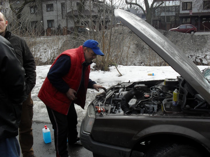 Jacław postanowił prawidłowo umocować układ wydechowy, Tasman walczył z uruchamianiem centralnego zamka za pomocą pilota, wtryskami paliwa i spryskiwaczami szyb. Wkrótce nadjechał Oleks i zabrał się za demontaż skórzanych foteli z „turbo_D”. Jacek z synem przyjechali „alfą”- ale i tam znalazło się coś do roboty przy filtrze gazu. Tylko ja jedyny biegałem, koordynowałem, robiłem fotki i w rezultacie tego nic przy swojej reni nie zrobiłem L Bywa czasem i tak.