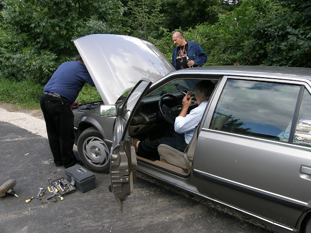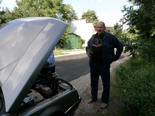 W drodze do Ustronia w okolicach Włocławka zaczęło coś dziwnego się dziać a hamulcami.Płynu nie ubywało, a z każdym kilometrem hamulce działały coraz gorzej. Telefon do Maćka i po opisaniu problemu jednoznaczna diagnoza- skończyła się pompa hamulcowa. Następny telefon do Adama ,czy ma pompę .Do łodzi dojechaliśmy z Tomalą już praktycznie bez hamulców. W planach nie było postoju w Łodzi ,jednak zmuszeni byliśmy pojawić się nad Jasieniem. Szybka pomoc przyjaciół z klubu : Adama i Oleksa /wymiana pompy/ i po godzinie czasu mogliśmy wyruszać w dalszą drogę do Ustronia.