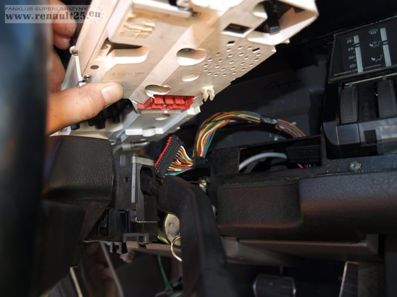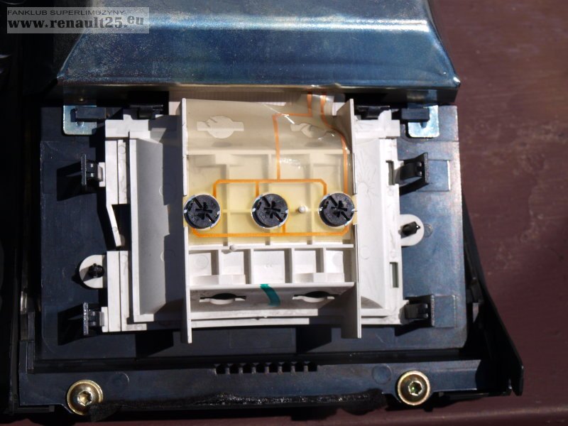 Odłaczamy wszystkie przewody podłaczone do licznika , wszystkich przycisków oraz regulatora oświetlenia. Wcześniej należy zdemontować głośnik komputera pokładowego przez otwór którego można w łatwy sposób poodpinać przewody z kontrolek oraz wyłaczników swiateł przeciwmgielnych i awaryjnych.