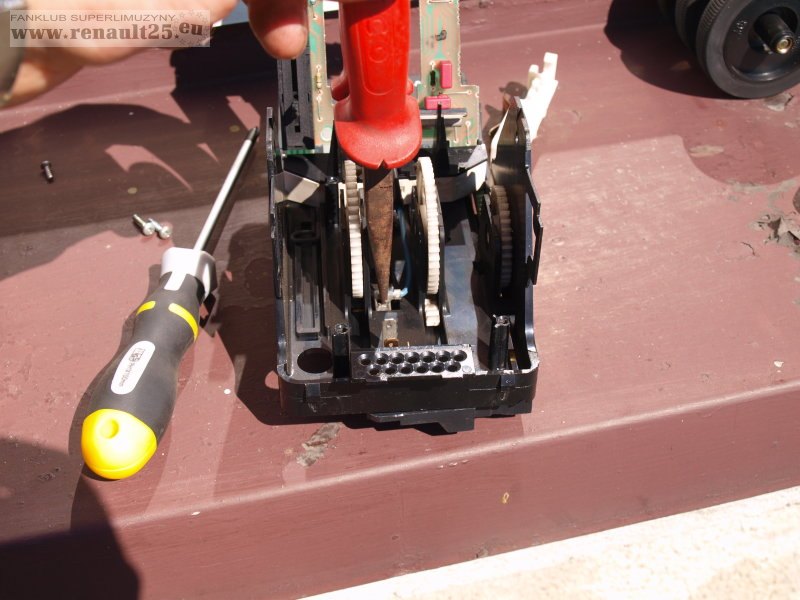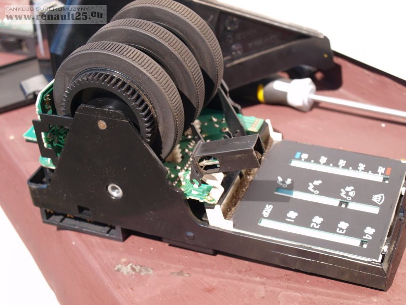 Na początek odklejamy czarną taśmę izolacyjną i unosimy do góry osłonę pokręteł i razem z nią wyciągamy płytkę na której znajdują się żarówki podświetlenia panelu ( 2x W1,2W ) , oraz 3 diody świecące.