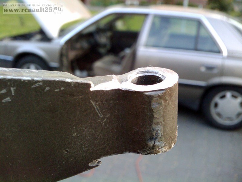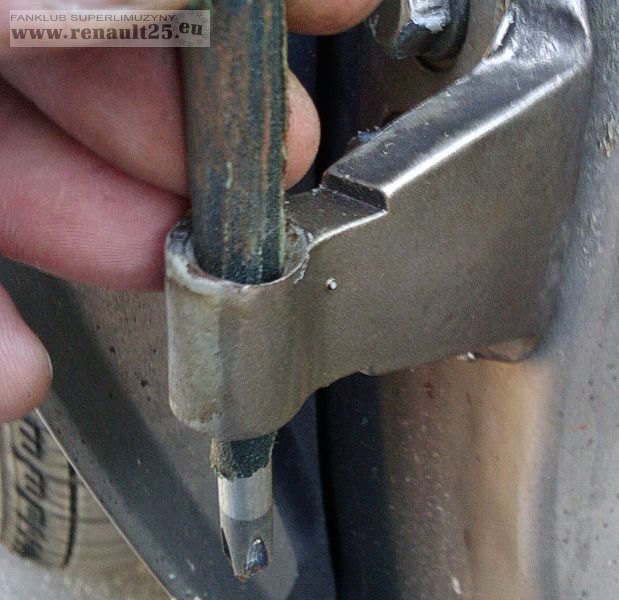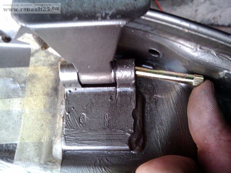 Zamocowałem zawias do samochodu i bardzo ostrożnie, pilnując pionu, przewierciłem trzpień wiertłem cieńszym nieznacznie od niego, aby nie uszkodzić samego zawiasu, gdyby pion okazał się bardziej poziomy ;).