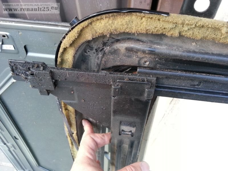 Najczęstrzą przypadłością szyberdachów w naszych Reniach jest wyłamywanie się zawiasów ciągnących/pchających szyber. Problem o tyle poważny, że jest to element mały i delikatny. W moim przypadku wyłamał się nie tylko zawias, ale cały przedni element mechanizmu odpowiedzialny za podnoszenie zawiasów przy domykaniu szybra. Na szczęście miałem drugi szyber, w którym wyłamany był jedynie prawy zawias. Jako że ten drugi szyber był w stanie o wiele gorszym, a i demontaż całego dachu to rozebranie całego wnętrza, postanowiłem wymienić jedynie narożniki mechanizmu prowadzenia.