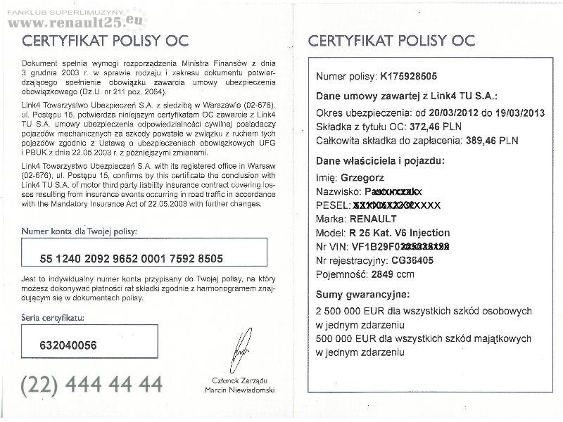 Dzisiaj otrzymałem z Link4 listownie potwierdzenie odnowienia umowy na kolejny rok na R25 ,którą jeździ Maciek. Całkowita składka zaproponowana opiewała na kwotę