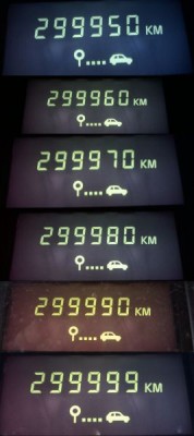 Do przeprowadzenia testu skłonił mnie przypadek Olusia, któremu najnormalniej w świecie licznik całkowitego przebiegu zrobił fikołka po przejechaniu 299 999 km. Ze zdziwieniem stwierdziłem naocznie, że jego auto pewnego dnia odmłodniało o, ni mniej ni więcej, 300 000 km. Jako że moim zegarom brakowało ledwie klikaset km do podobnej sytuacji, postanowiłem prześledzić, udokumentować i potwierdzić seryjność tego fenomenu. Rzecz dotyczy licznika elektronicznego w wersji PH II. Podobno widziano na wyświetlaczu przebiegi wyższe od 300 000, ale prawdopodobnie chodzi o R25 PH I. Być może reset przebiegu po 300 000 km wprowazono dopiero w PH II. Jeśli znacie przykłady wskazań wyższych od 300 000 km, proszę o wstawienie zdjęć i opisanie wersji w jakiej taki przypadek miał miejsce. Oficjalne dokumentacje nie wspominają nic o momencie fikołka zegarów :)